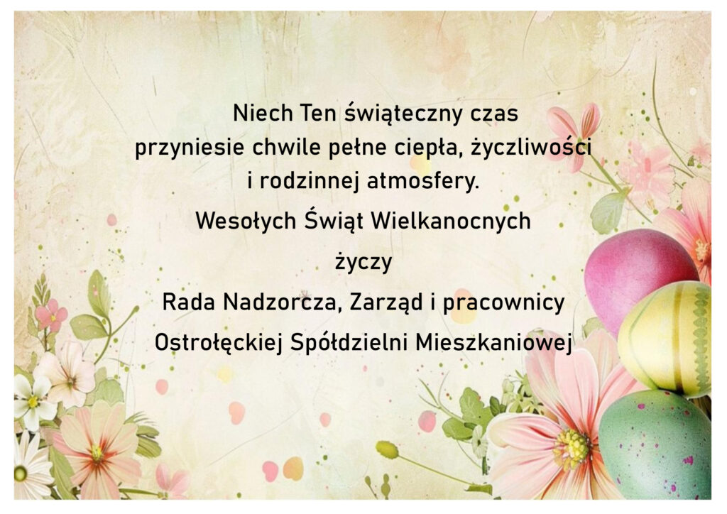 Życzenia z okazji Świąt Wielkanocnych od Rady Nadzorczej, Zarządu i pracowników Ostrołęckiej Spółdzielni Mieszkaniowej